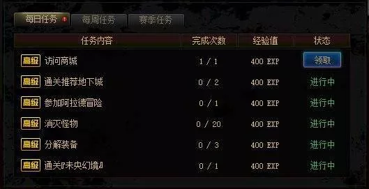 如果你是高級冒險家,那么你的每日任務是400經驗/個,一共也是6個任務,合計2400經驗/天。(與上期一致)