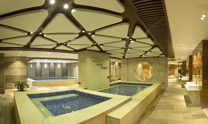 內(nèi)部設(shè)施配套完整,客房、別墅、各式建筑中西合璧,博采眾長,均按五星級溫泉酒店標準建造。