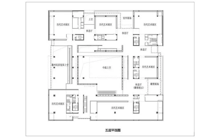 “ 四水歸明堂,歸水亦宏揚(yáng)”,庭院在安徽傳統(tǒng)建筑文化中,具有中心突出的位置。取意“四水歸堂”,建筑核心部位形成向天開(kāi)敞的公共大廳,其空間通過(guò)一系列轉(zhuǎn)折勾連、錯(cuò)動(dòng)交疊的通高片墻進(jìn)行多樣化的限定。