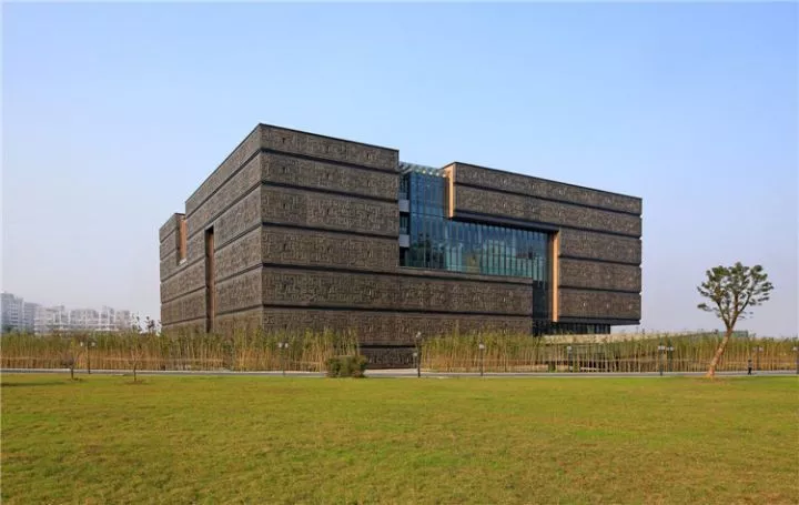 方形體量在西面、西南、西北三面落地,在主入口的東面架空懸挑,而緊貼地面的低平基座則從東面嵌入主體建筑之中,并向東伸出主引橋,結(jié)合由東至西的文博園廣場(chǎng)、橋頭廣場(chǎng)、竹海、水面、入口平臺(tái)等場(chǎng)地景觀(guān)要素,形成從城市走向博物館的縱深序列。