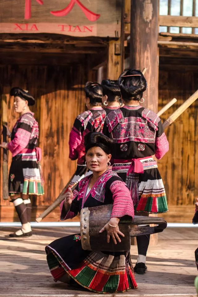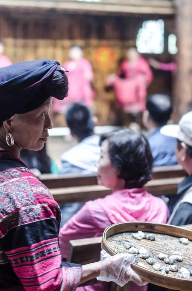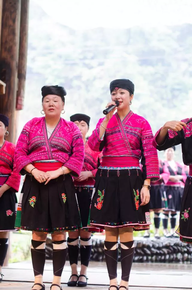 來(lái)到黃洛瑤寨,紅瑤族的女子很少會(huì)將自己的長(zhǎng)發(fā)散開(kāi),所以想要直觀感觸長(zhǎng)發(fā)的長(zhǎng)度能夠去觀看他們的民族扮演,扮演在村寨的劇場(chǎng)里面進(jìn)行,扮演一共有四部分,第一部分是特征瑤族歌舞扮演;第二部分是游客互動(dòng),男性游客親自體會(huì)瑤族嫁娶;第三部分則是曬紅衣。