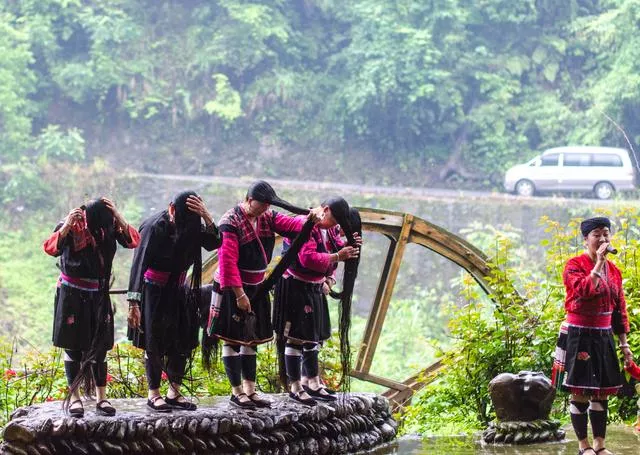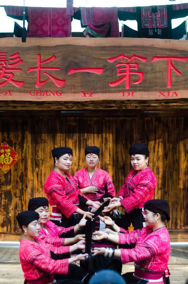 扮演的第四部分則是游客們最為等待的展現(xiàn)長(zhǎng)發(fā), 這些瑤族女子,對(duì)她們來(lái)說(shuō),頭發(fā)就如自己的身體,是不能輕易剪的,所以未婚女子在十八歲的時(shí)分才能將頭發(fā)剪了,代表自己已成人。