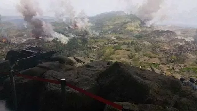 百團(tuán)大戰(zhàn)紀(jì)念館內(nèi)分上下兩層,一層展出珍貴照片200余幅、實物900余件及電子講解、檔案史料等大量文史資料。二層充分運用聲光電、全景畫及大型沙石模型等手段展現(xiàn)出獅腦山上我軍那場頑強(qiáng)的鏖戰(zhàn)場景。
