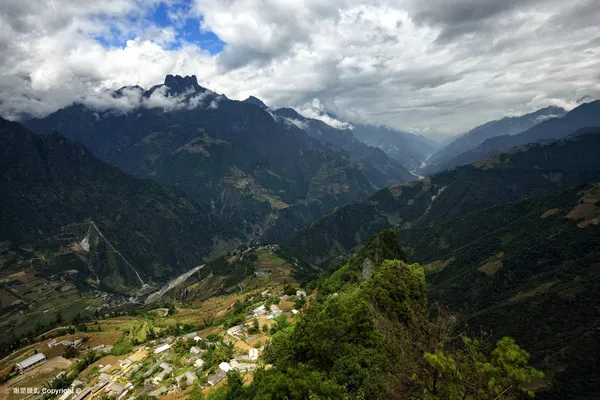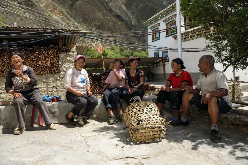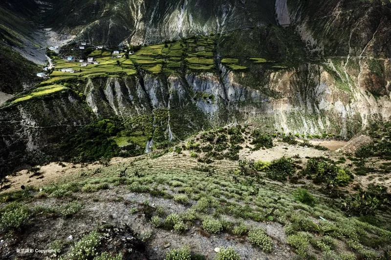 西藏察隅縣察瓦龍鄉(xiāng)全景 穿越貧瘠的干熱河谷時(shí),給我印象最深的是那些“爬在懸崖上的村莊”。當(dāng)?shù)厝顺浞掷脥{谷峭壁上一塊突出的臺(tái)地建房而居,從遠(yuǎn)處望去,荒涼的山崖上斜掛著幾幢別致的藏居和一小片農(nóng)田,實(shí)在讓人擔(dān)心那么小的一塊臺(tái)地是否抵抗得了自然災(zāi)害。從松塔村進(jìn)入干熱河谷后,在怒江峽谷松塔村進(jìn)入干熱河谷后,在怒江峽谷兩岸,這樣的村落不斷出現(xiàn)在眼前,其中崗藏村給我視覺震撼最大。崗藏村遠(yuǎn)離察瓦龍鄉(xiāng),孤單的“爬”在峭壁上,只有一條可以勉強(qiáng)通行拖拉機(jī)的小路。村莊建在一個(gè)近300米長(zhǎng)的坡上,而縱深不過(guò)100米,旁邊就是怒江峽谷。但就在這樣一小塊地上,僅種植青稞和玉米就養(yǎng)活了25戶人家120余人。
