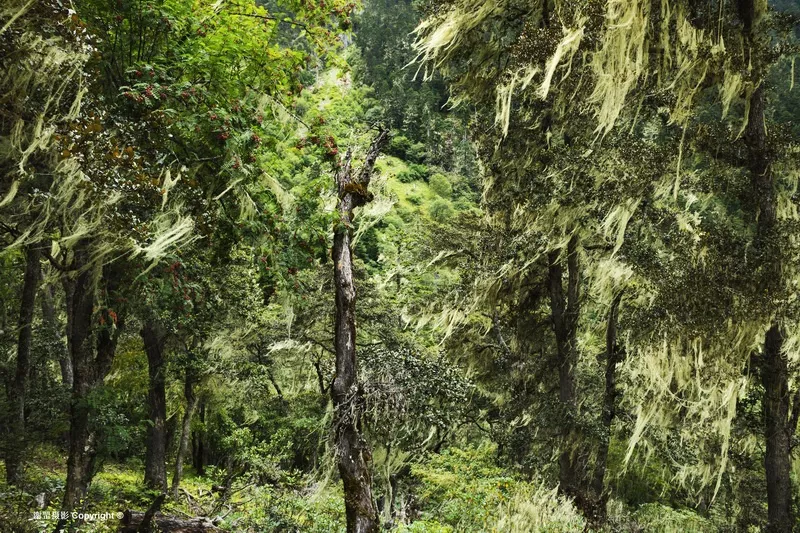 伯舒拉嶺高寒地帶-折拉山口(海拔4764米)高山漠土與風(fēng)化石帶 越過(guò)海拔4764米的折拉山口后,便順著山谷急速而下,在明期村森林區(qū)時(shí),便一道獨(dú)特的自然景觀帶,那就是松蘿溝。松蘿有多種稱呼,生于深山的老樹枝干或高山巖石上,成懸垂條絲狀。有很強(qiáng)的抗菌和抗原蟲的作用,有清肝,化痰,止血,解毒之用。明期的松蘿絲長(zhǎng)濃密,面積大,幾乎布滿山溝里的所有樹木上,風(fēng)吹之時(shí),隨風(fēng)飄逸,予人一種夢(mèng)幻般的享受。