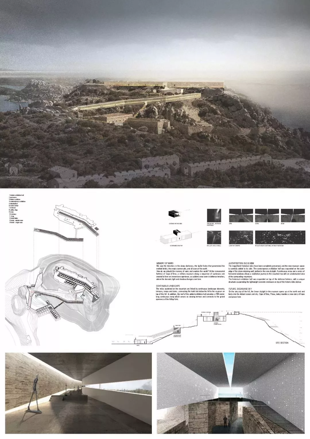 下面是小編為各位讀者準(zhǔn)備的參考圖紙,由YAC舉辦MILITARY MUSEUM,旨在將Capo d'Orso的軍事炮臺(tái)改造成軍事博物館。雖然這片區(qū)域的戰(zhàn)爭(zhēng)已經(jīng)結(jié)束,但留下了軍營(yíng)及炮臺(tái)等歷史記憶,這些空間具有重要的現(xiàn)實(shí)意義,可以將其改造成博物館建筑,讓更多年輕的一代參觀。