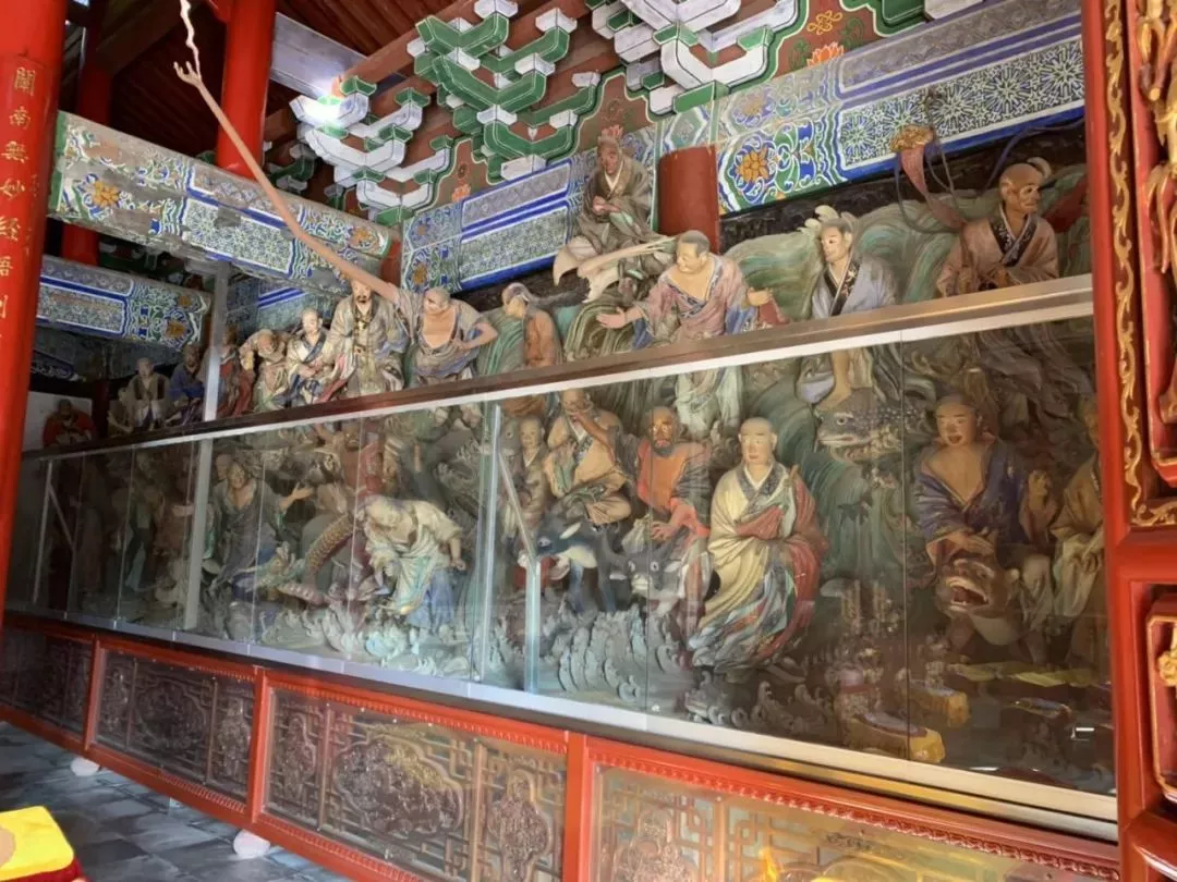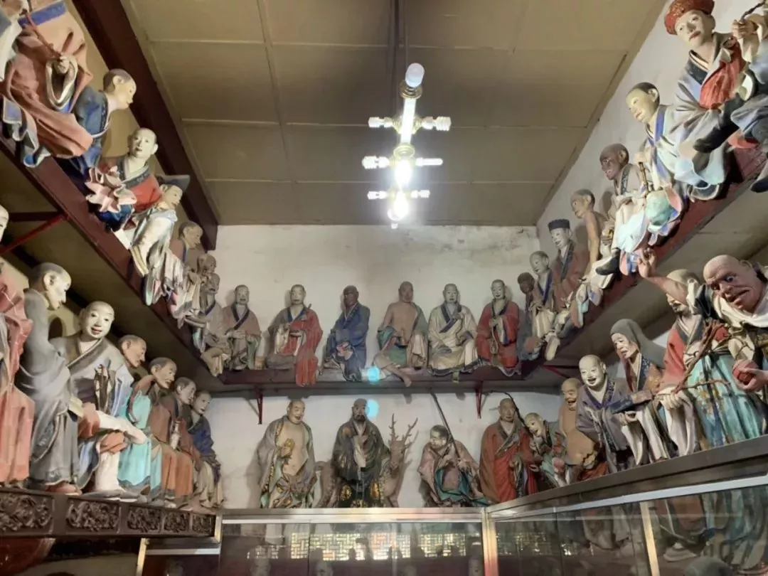 五百羅漢分布為大殿兩壁68尊、天臺萊閣216尊、梵音閣216尊,由清朝四川泥塑家黎廣修及五位助手歷時七年(1883年-1890年)完成。大雄寶殿的角上有一塊元朝延祐三年立的圣旨,其內容為敕封該寺住持玄堅為“頭和尚”要求官員軍民予以保護,并賜存《大藏經》