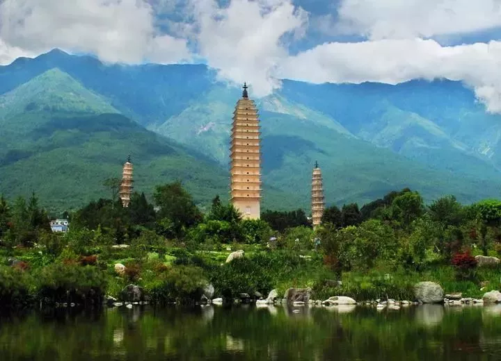 建于南詔時期,東對洱海,西靠蒼山,崇圣寺在清咸豐年間燒毀,只有三塔完好地保留下來。崇圣寺三塔,由一大二小組成。大塔叫千尋塔。千尋塔與南北兩個小塔的距離都是70米,呈三足鼎立。千尋塔現存高度是69.13米,底寬9.9米,為方形密檐式空心磚塔,一共有16級。