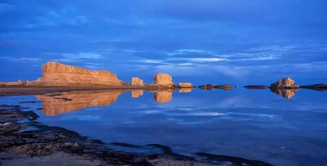 【水上雅丹】陽光照在水雅丹上,顏色金黃,石柱和倒影感覺升到了半空中,像懸浮在空中的魔幻城堡。簡直美得沒有邊了!只有各種驚嘆各種拍,完全停不下來!