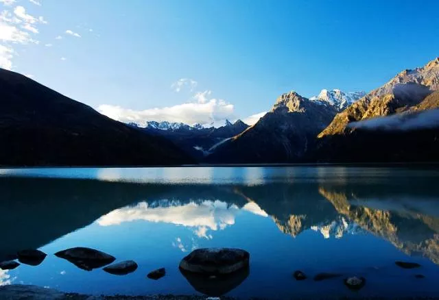 站在湖邊,宛若鏡面般的湖面倒影著藍天白云和皚皚雪峰,宛如仙境。
