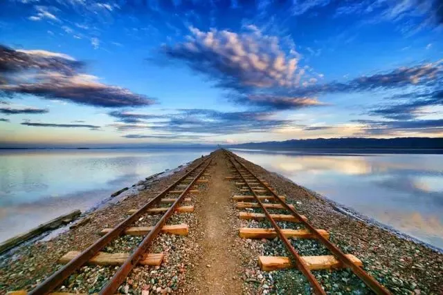 茶卡鹽湖最吸引人的除了湖面,還有那條通往湖心的鐵軌。這條鐵軌始建于1958年,所用部分鐵軌是1904年生產(chǎn)。