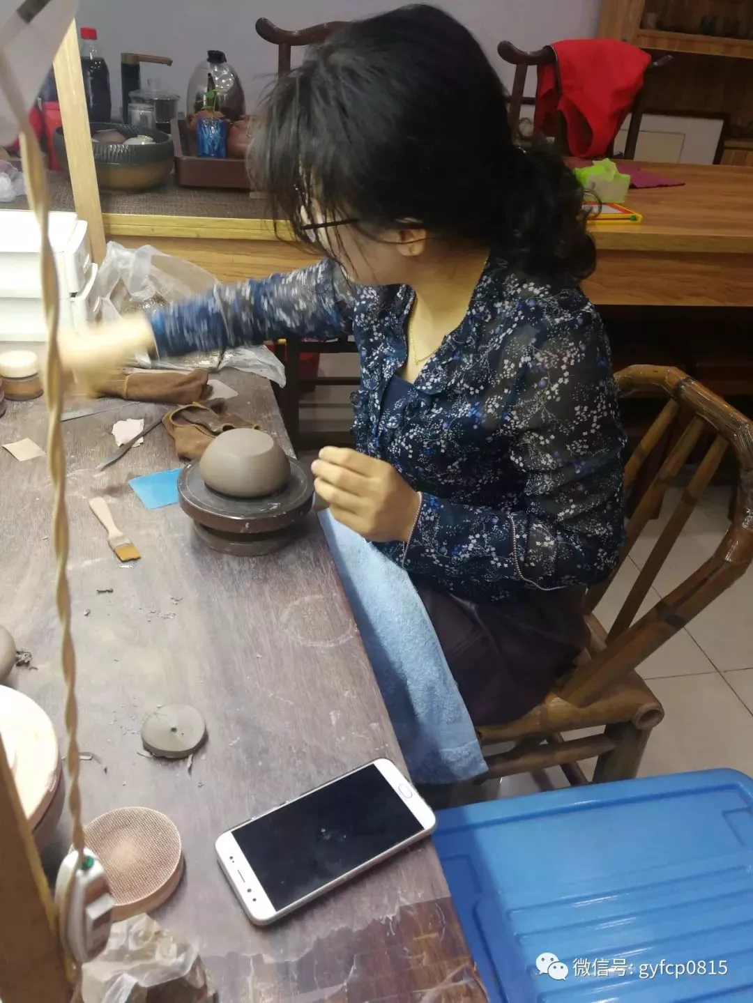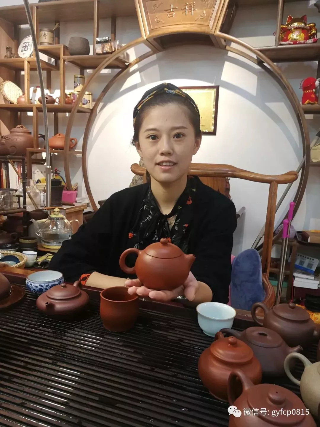 繼續(xù)游覽,在一個紫砂館里看到一位典型的江南美女正在低頭制作茶壺。這位美女自己經(jīng)營、自己制作著獨具自己特色的紫砂壺。經(jīng)過短暫交流,知道她叫顧嬌。真是名如其人,嬌媚嬌美嬌滴滴。在我的要求下,她停下手里的活計,答應(yīng)我可以拍照。這才有了和美女的美好邂逅。
