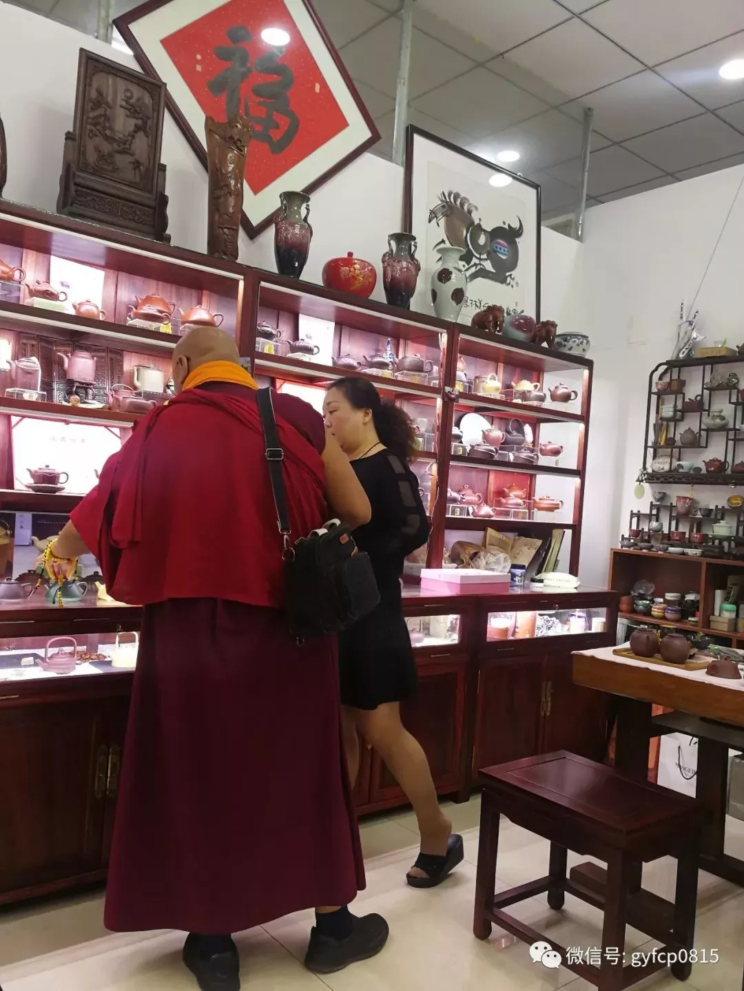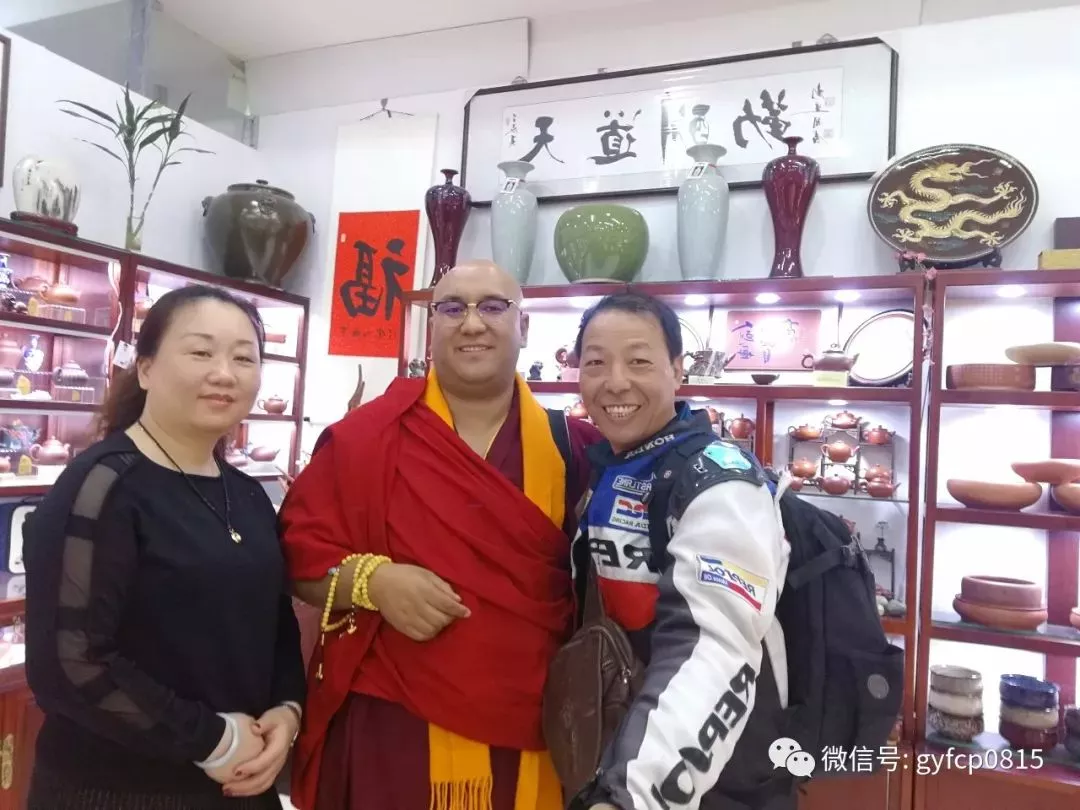 先來到青年陶藝家袁麗萍的藝術(shù)館游覽。這里琳瑯滿目,高中檔俱全。在我參觀后和小袁聊天的時候,進(jìn)來一位她的老朋友,在青海出家的喇嘛健旺大師也來選購紫砂壺。在我的