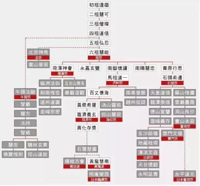 禪宗祖師上溯到印度摩訶迦葉;中國(guó)的初祖為印度來(lái)華僧人菩提達(dá)摩,二祖為慧可,三祖僧璨,四祖道信,五祖弘忍。弘忍分幾派,最大的有兩派,神秀在北方傳教,恪守上代所傳教法,主張坐禪息念,“拂塵看凈”?;勰茉谀戏胶虢?,不拘地形式,不執(zhí)著于名詞概念,不重坐禪,認(rèn)為“即心是佛”,只要內(nèi)心直覺(jué)頓悟,便可成佛。歷史上稱“南能北秀”。由于慧能的方法簡(jiǎn)便易行,因此勢(shì)力越來(lái)越大。流傳至今的禪宗,都屬慧能一派?;勰茉?/p>