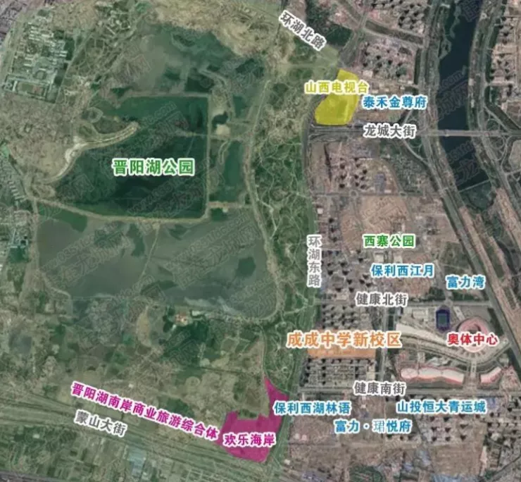 再看成成中學新校區(qū)的周邊,西側是華北地區(qū)最大的水域公園晉陽湖公園,東側是山西省內(nèi)最大的體育中心奧體中心,可以想象將來在這兒上學的學生得有多幸福。下學在晉陽湖公園可以擁抱自然、陶冶情操,或是相約幾個同學在奧體中心內(nèi)打球鍛煉、游泳健身……