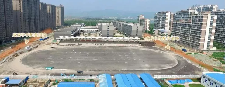 偌大的風雨操場正在建設中,以及成成中學新校區(qū)兩側規(guī)劃的配套道路也開始同步施工。