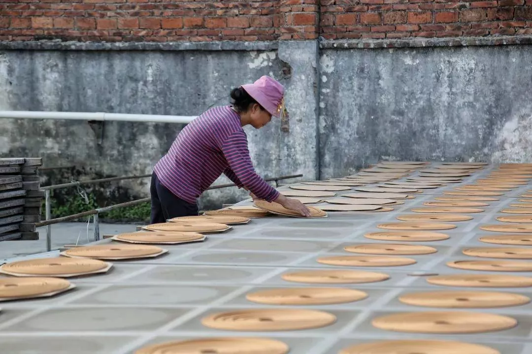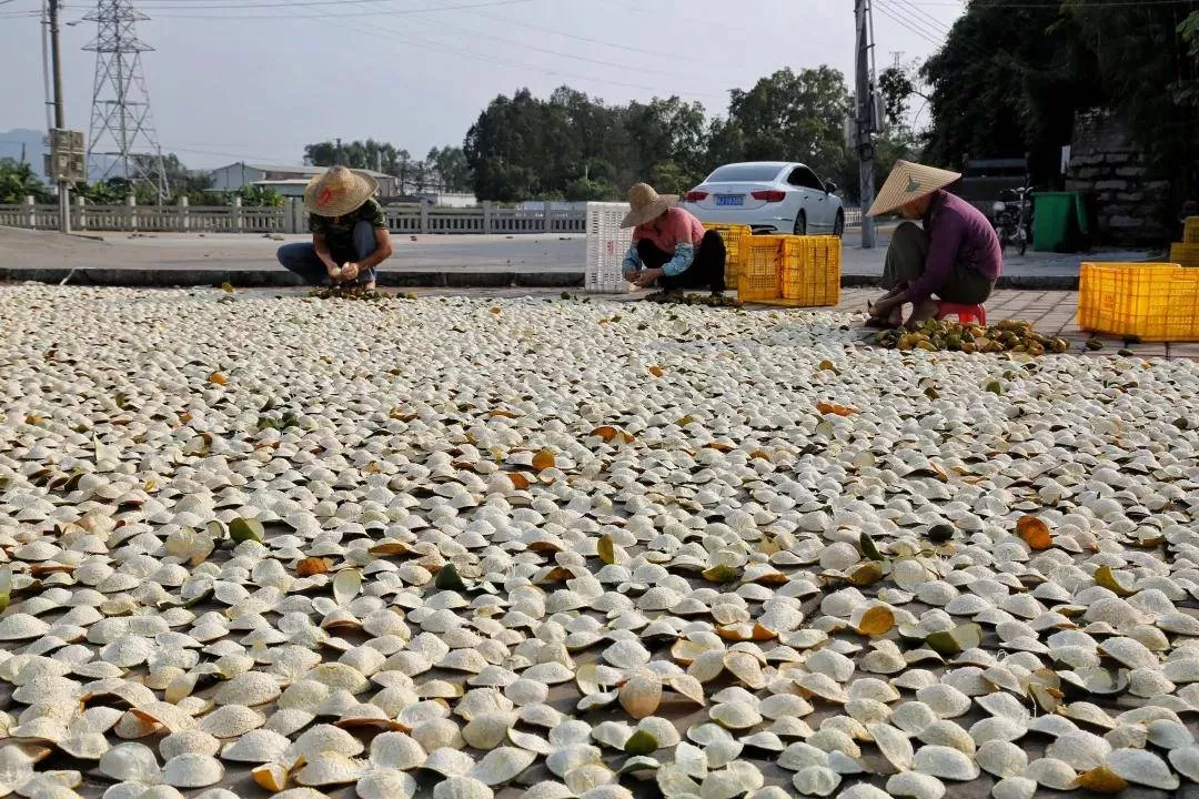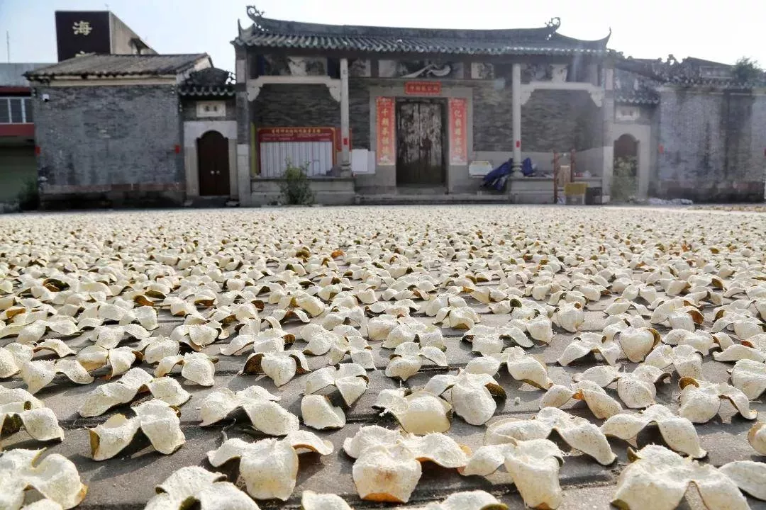 以陽(yáng)光自然生曬的陳皮,靜待歲月陳香,走在新會(huì)的村落之間,可以說(shuō),有陽(yáng)光照射到的地方,就總能見(jiàn)到當(dāng)?shù)厝嗽谌齼蓛傻厣鷷耜惼?,這是他們幫補(bǔ)家計(jì)的一種途徑,這更是家家戶戶的日常。