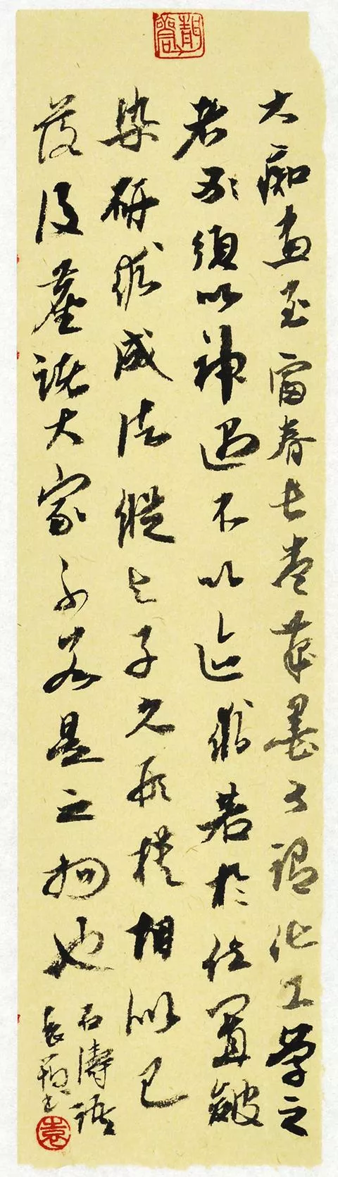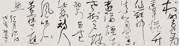 本次展覽規(guī)模雖小,但亮點紛呈。首先,展廳布置的樸素而高雅,不再設繁縟的開幕式環(huán)節(jié),流程從簡,清風撲面;其次,參展的藝術品匠心獨運,令觀者回味無窮;最后,藝術展品形式豐富多樣,國畫有花鳥、人物、山水;書法有章草、行草、狂草。特別是幾處書法與繪畫的完美結合,再現(xiàn)了中堂這一傳統(tǒng)的藝術樣式,彰顯了中國的古典氣派。