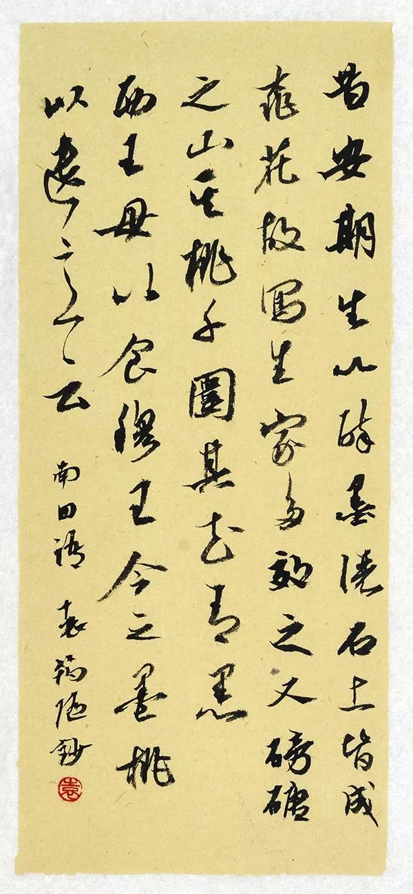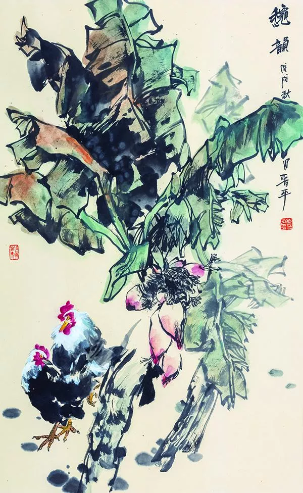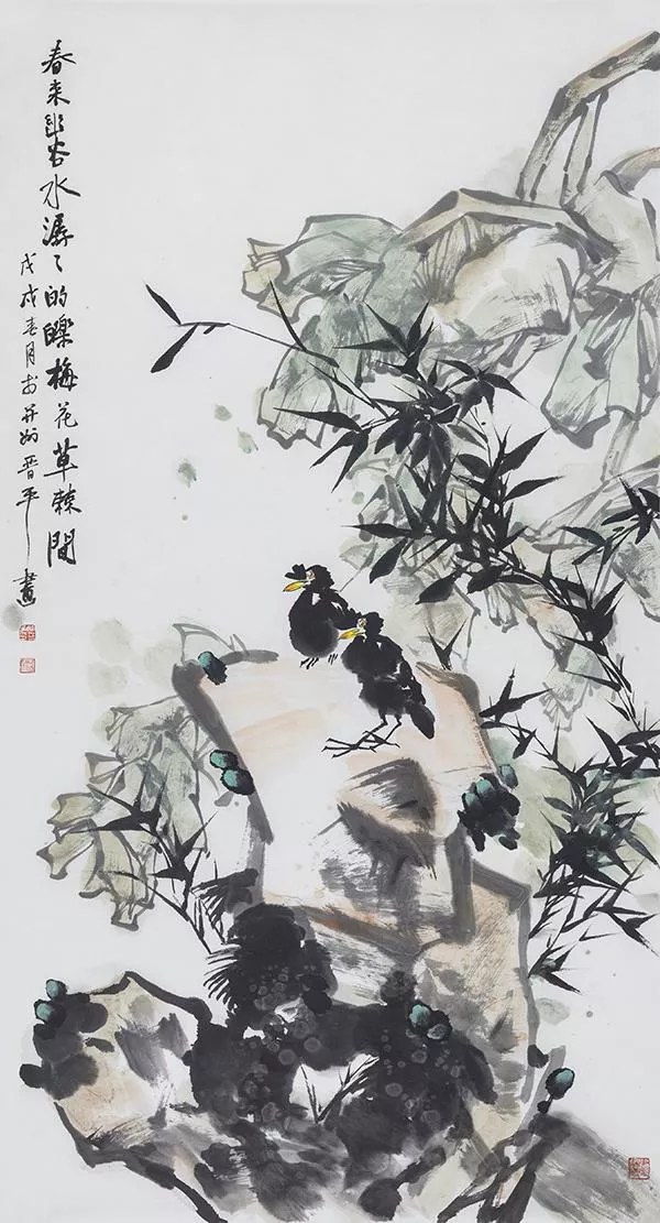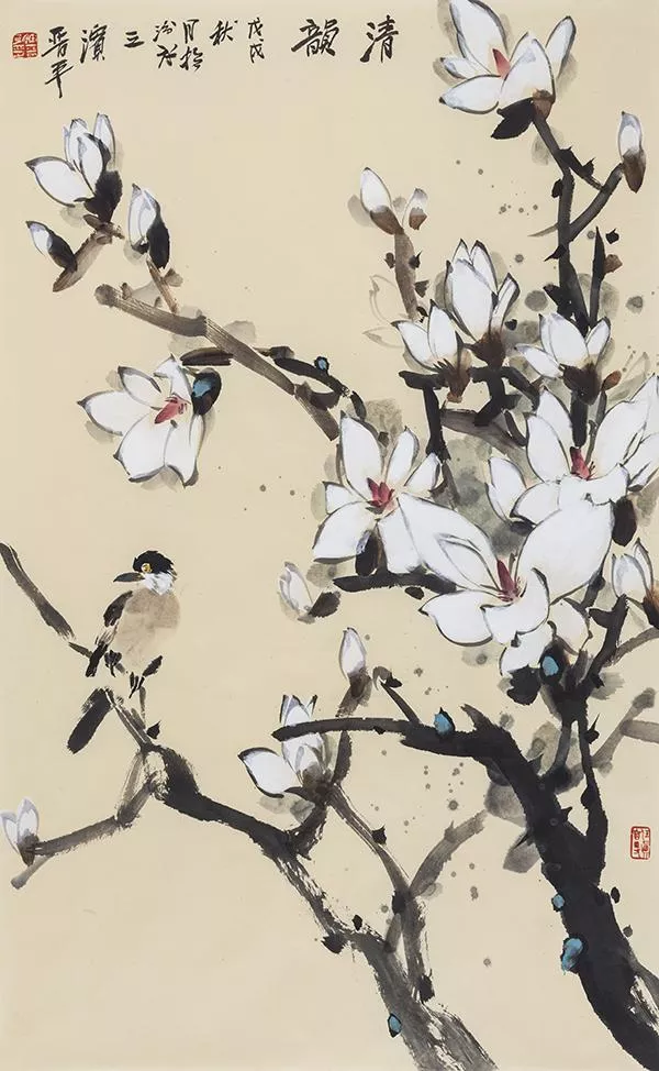 郭健的行書作品一經(jīng)亮相,便彰顯不凡,縱橫取法,沉著雅逸;熊晉以章草為形,大草為勢,古樸渾穆、縱橫瀟灑;袁筠書法以“二王”作底,兼取諸家之長,個性特色鮮明;徐晉平的花鳥用筆粗狂率真、拙樸硬朗,暈染致密濃稠,層見疊出。孟旭耀以人物畫見長,他筆下的仕女形象柔腸百轉、冷艷欺雪、余香入衣。