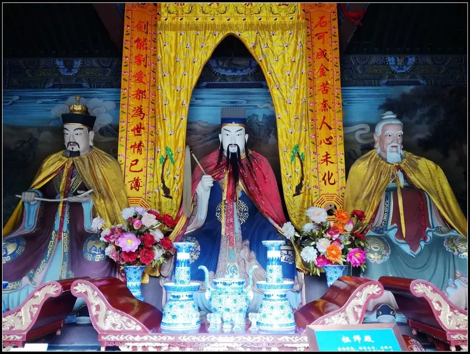 三祖殿祭壇上并排塑有祖師像三尊,正中為呂洞賓,左側為王重陽,右側為丘處機。故稱三祖殿。