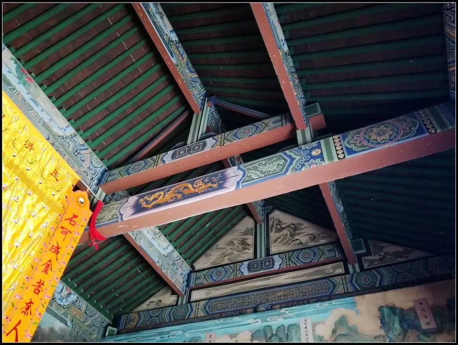 三祖像,從左側至面分別為王重陽、呂洞賓、丘處機三祖殿的梁架部分三祖殿兩側各有一座配殿,東為三官殿,西為奶奶殿,對稱建筑,均是面闊五間,進深兩間,單檐懸山灰瓦頂,檐下不設斗拱,明間開隔扇門,次、稍間安裝隔扇窗。三官殿供上元天官(聯(lián)云:天官地官水官只在心官不昩,求福賜福護福務須積福為先),中元地官(聯(lián)云:瑞草齊開日,際地官之考釋;桂花將綻月,當少昊之司權。)下元水官(聯(lián)云:鋪天