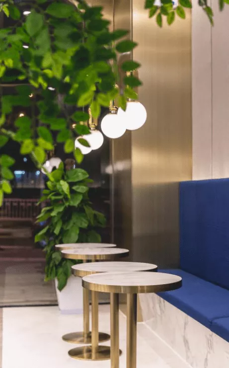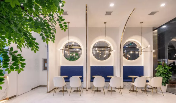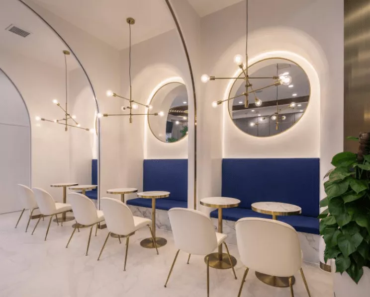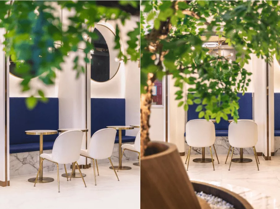 從入口看向吧臺(tái)方向:整體室內(nèi)空間以白色基調(diào)為主,金色與藍(lán)色碰撞,頂部金色不銹鋼金屬條造型做為設(shè)計(jì)亮點(diǎn),貫穿整體空間。