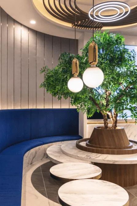 卡座細(xì)部:藍(lán)色的寧?kù)o致遠(yuǎn),搭配金色凸顯優(yōu)雅時(shí)尚感。