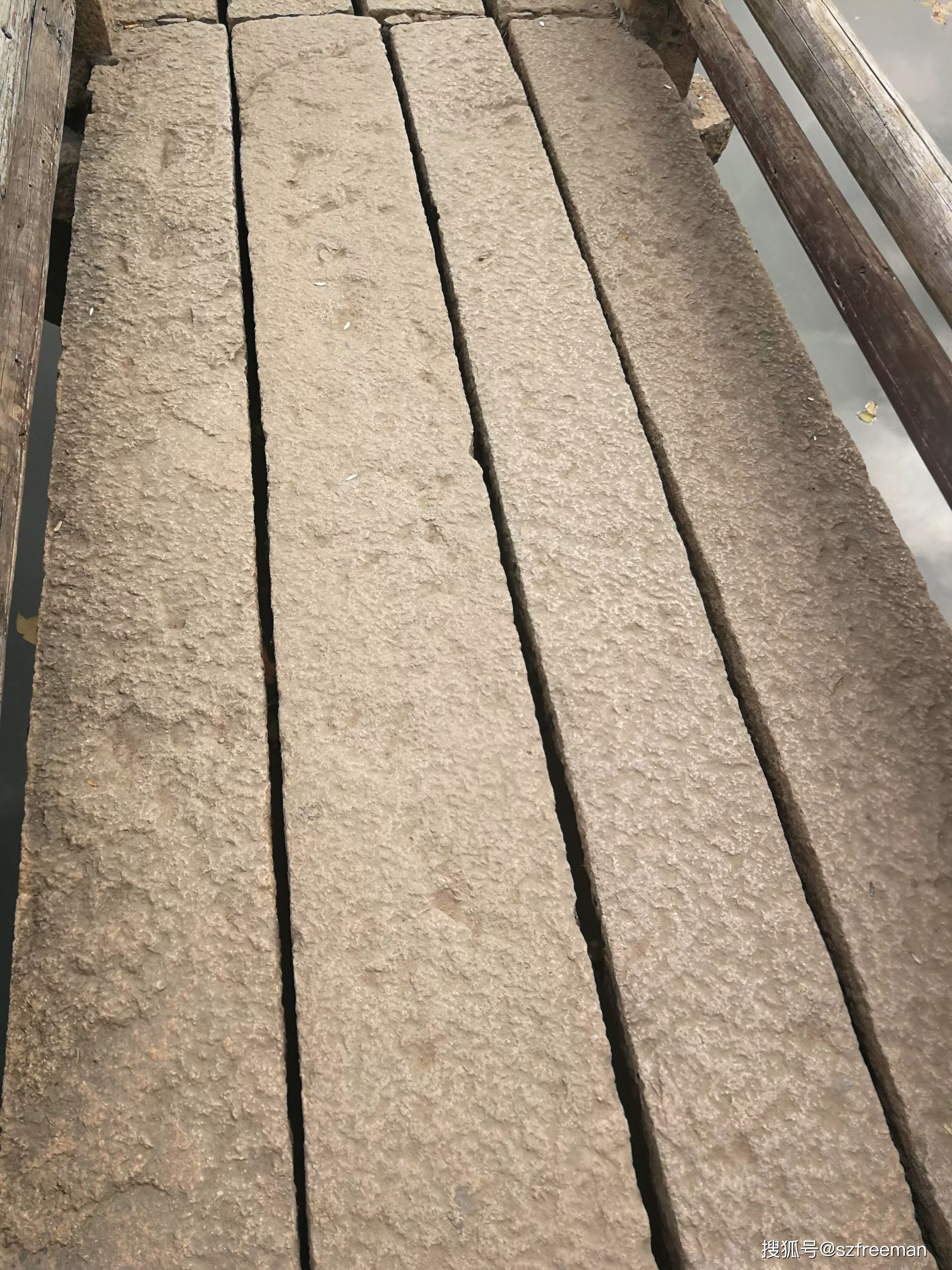 曲橋上長長的石板條,中間有些縫隙。