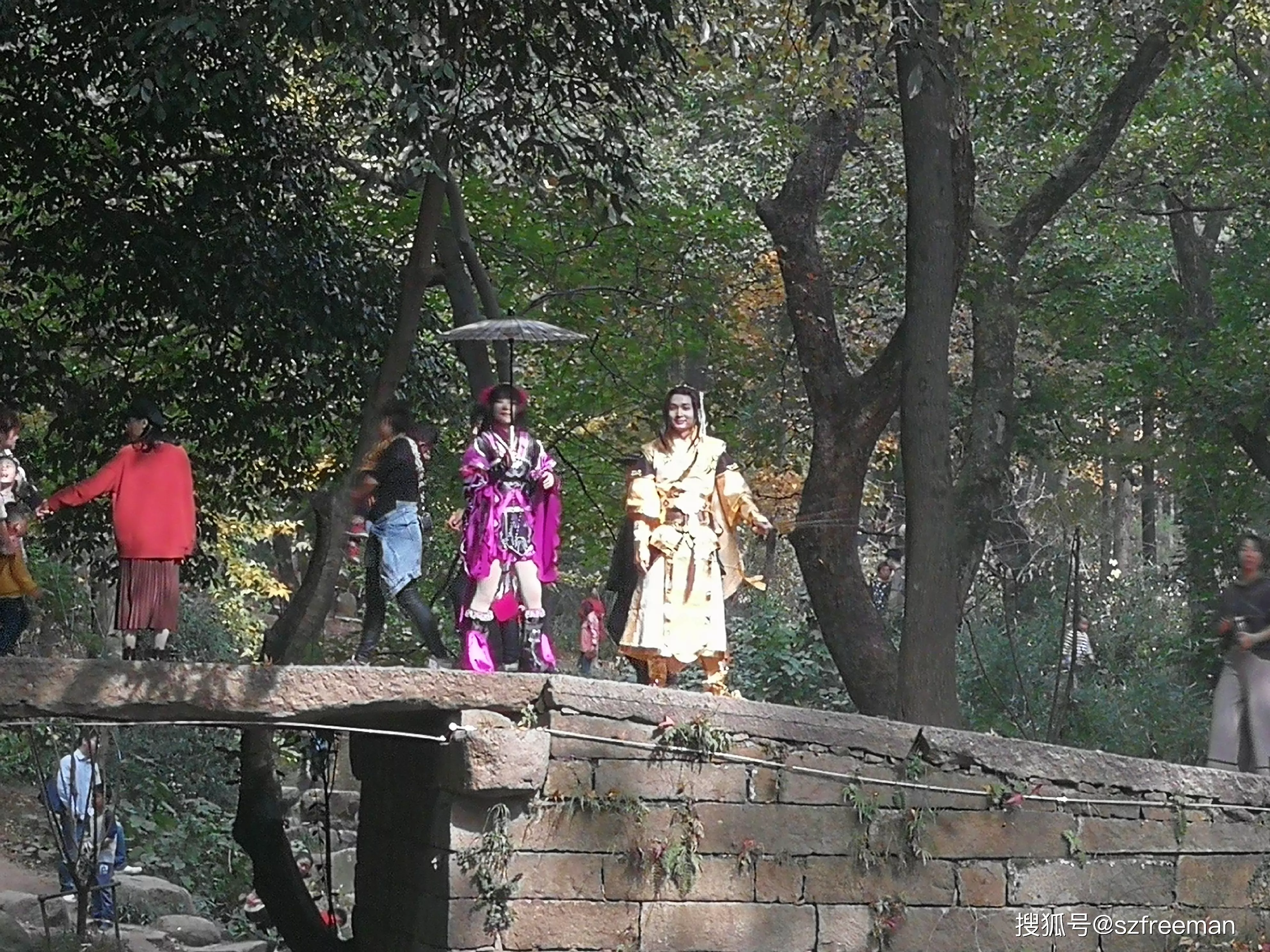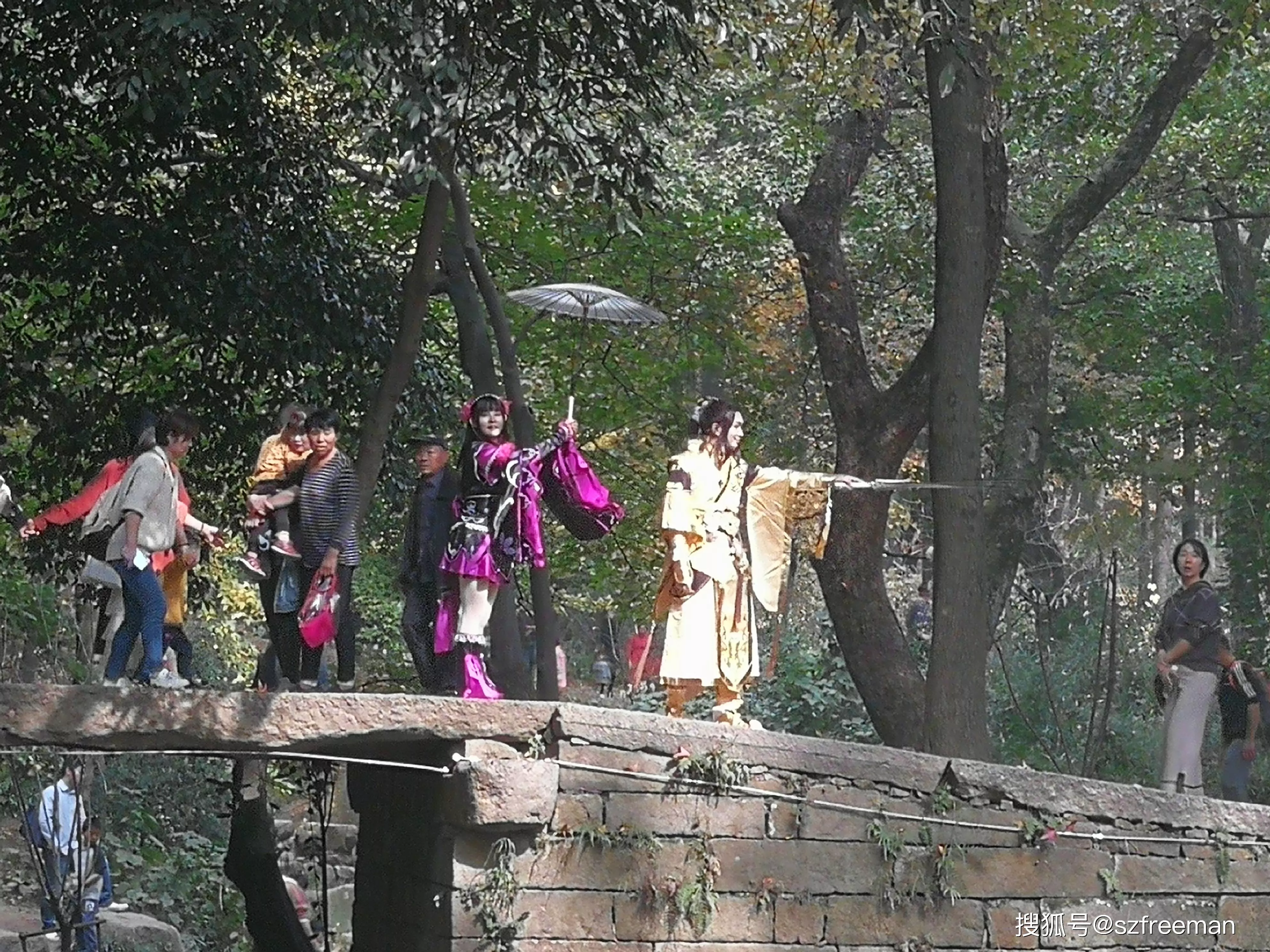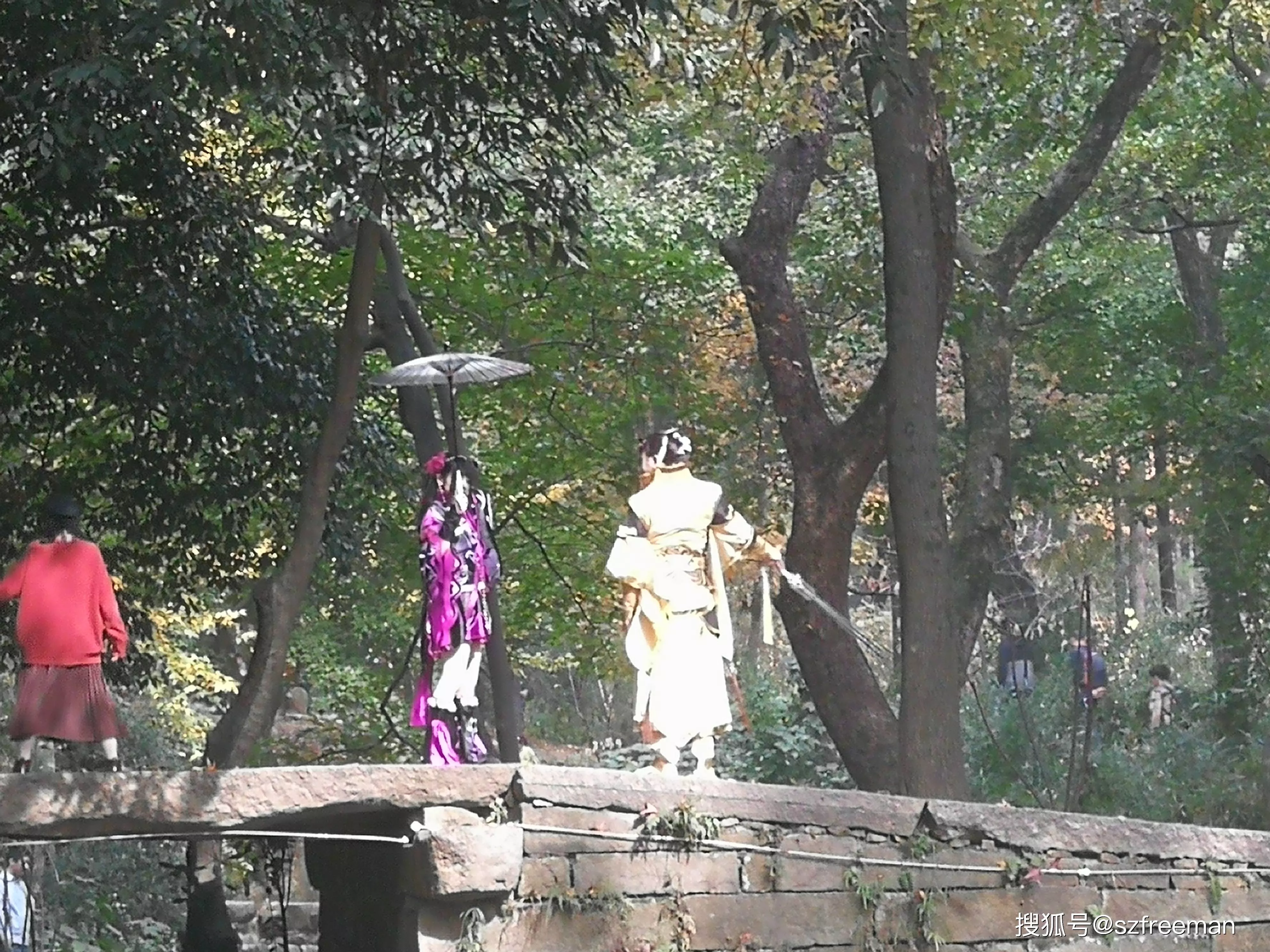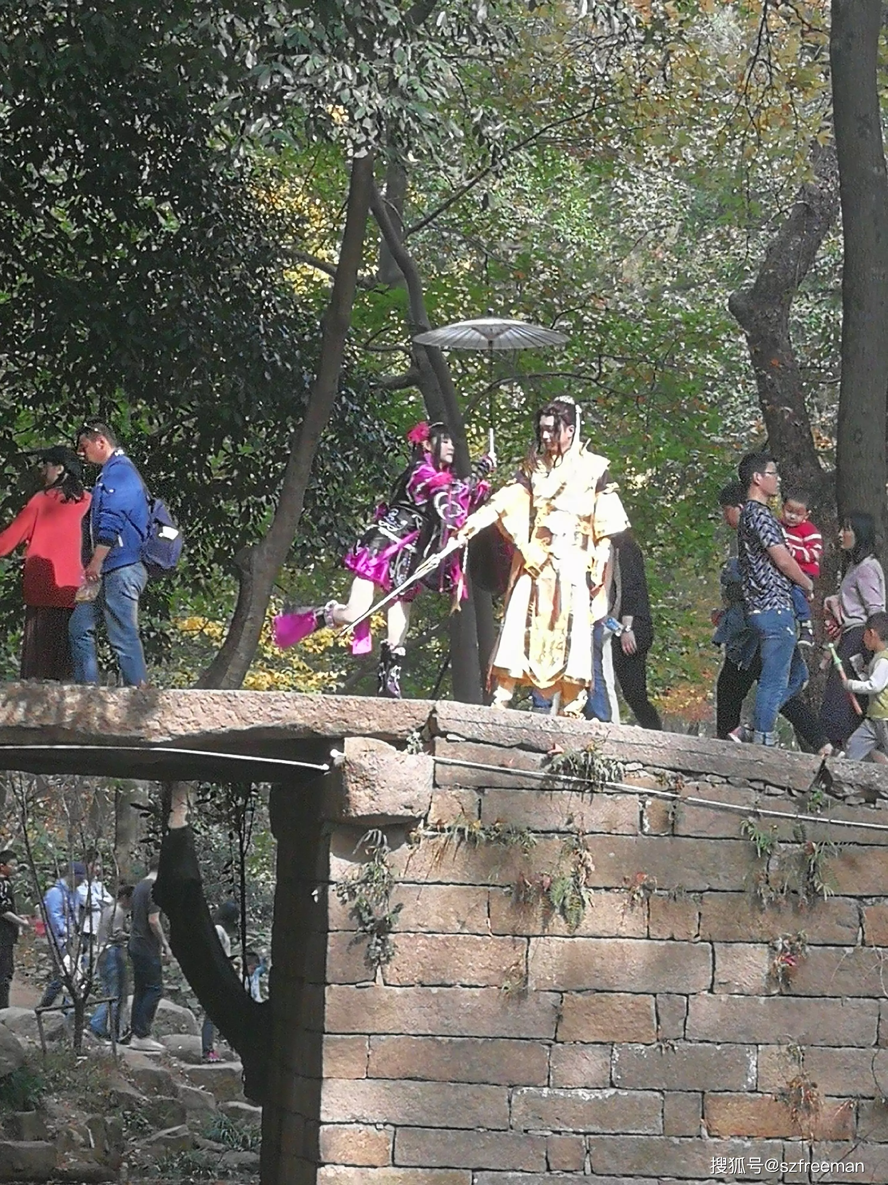 原來是小哥哥小姐姐來拍片了,在橋上舞刀弄槍。