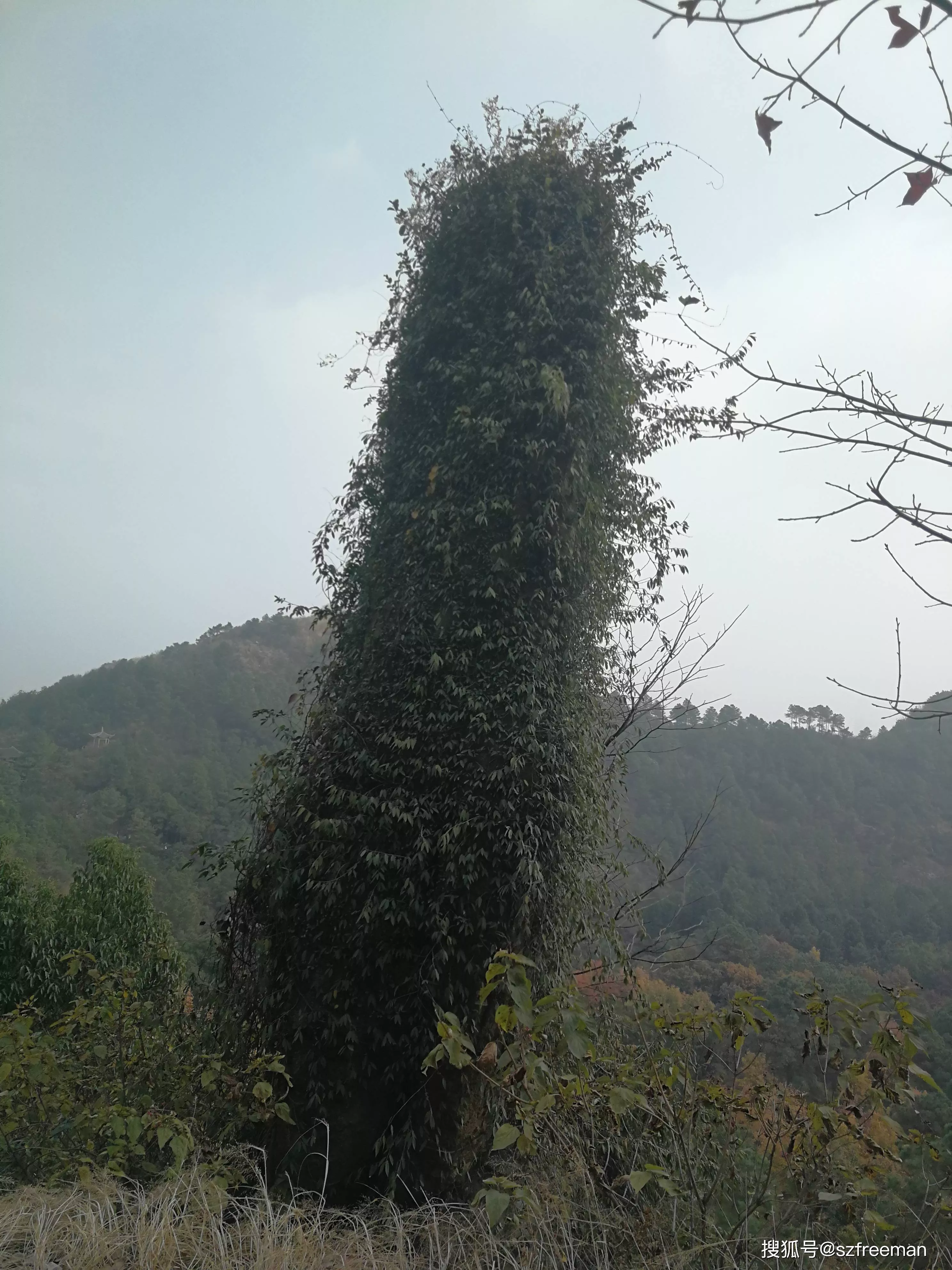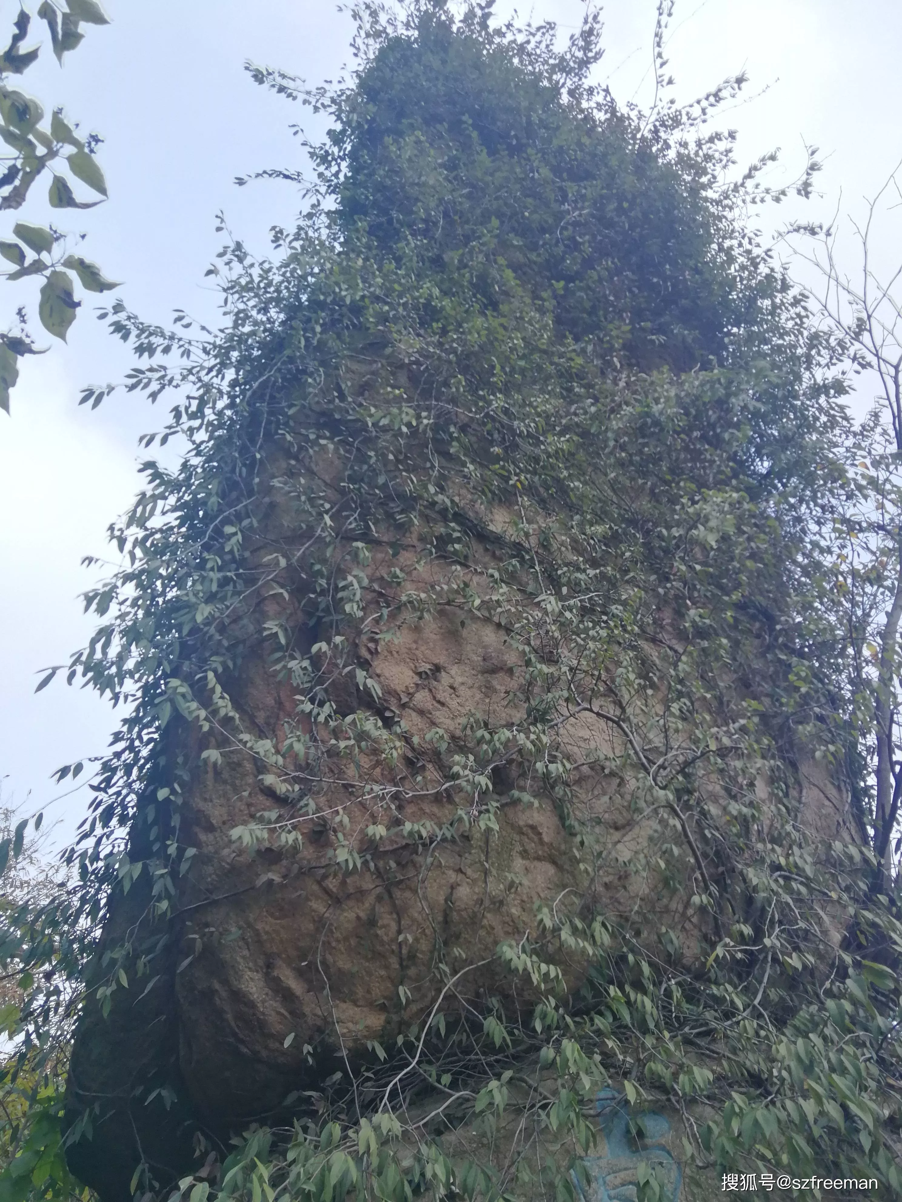 巨石完全被綠色的藤蔓包裹著。