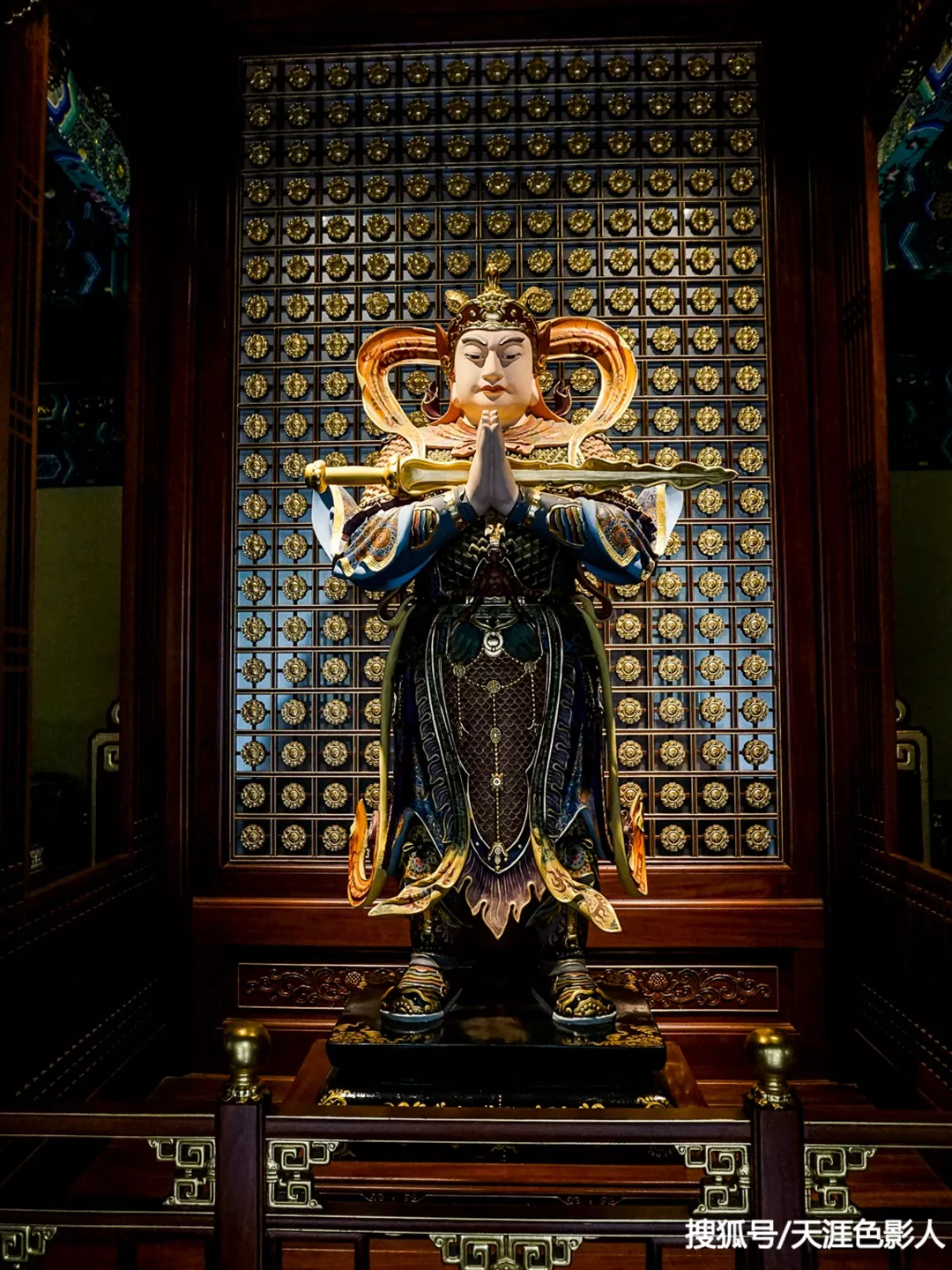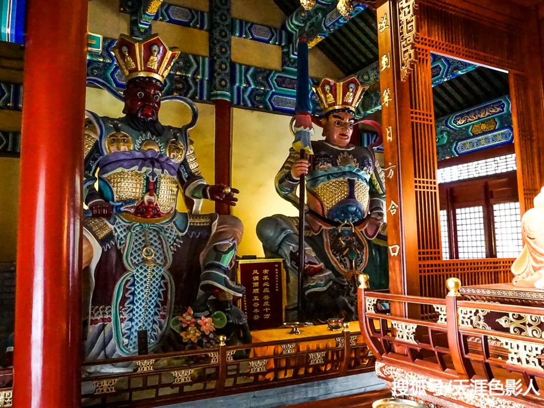 大悲寺坐西朝東,天王殿上為康熙帝手書”敕建大悲寺“。圖為天王殿內(nèi)倒坐韋陀菩薩。