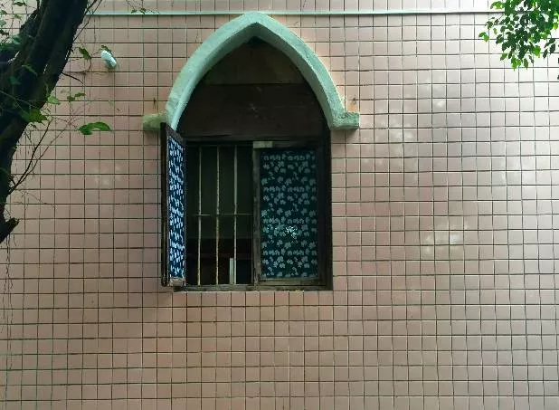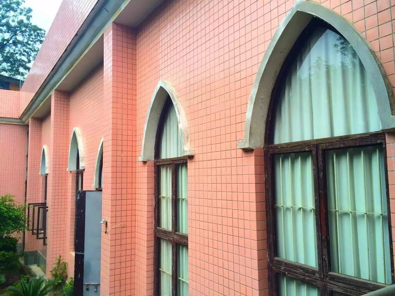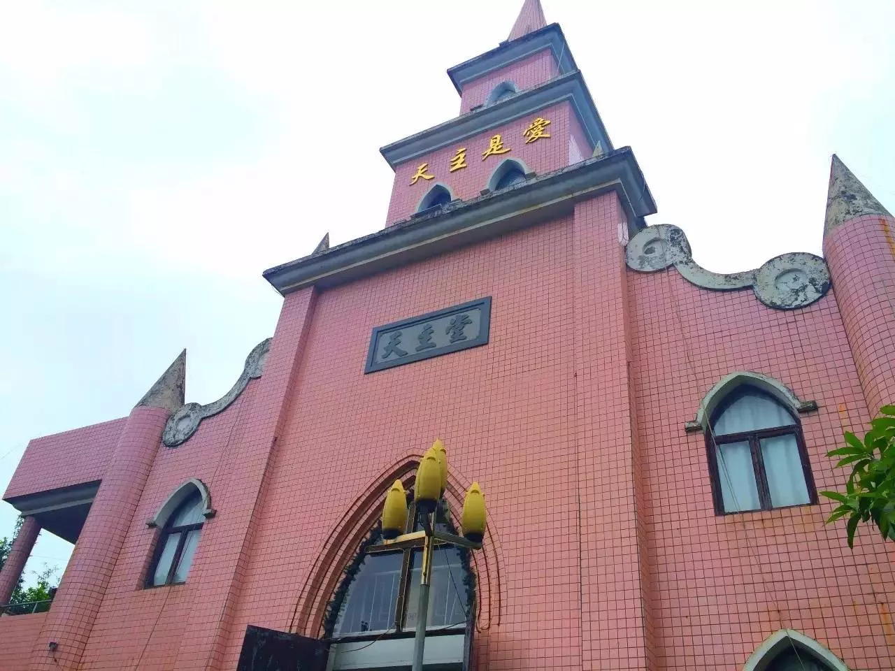教堂的外觀貼滿了粉色的瓷磚