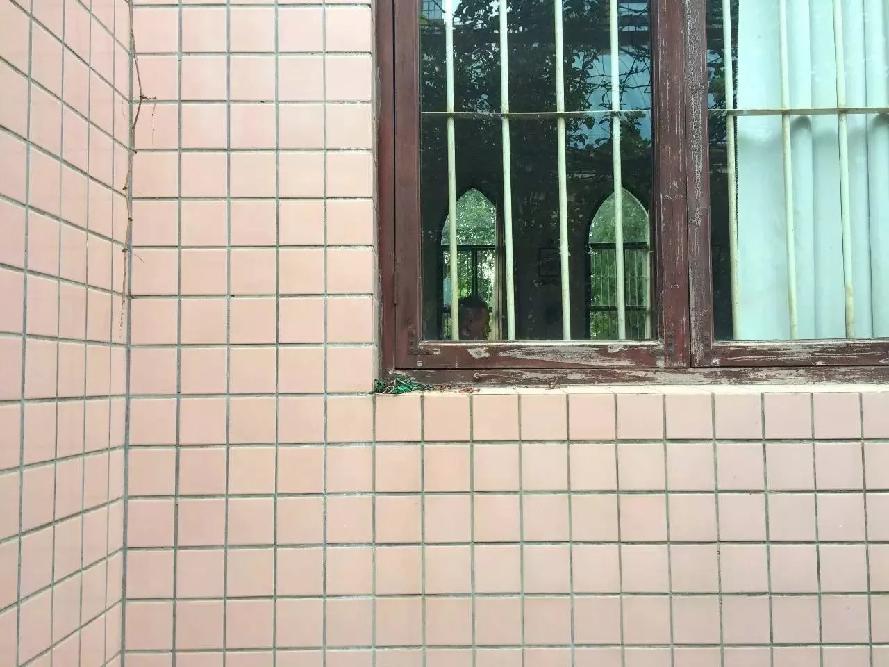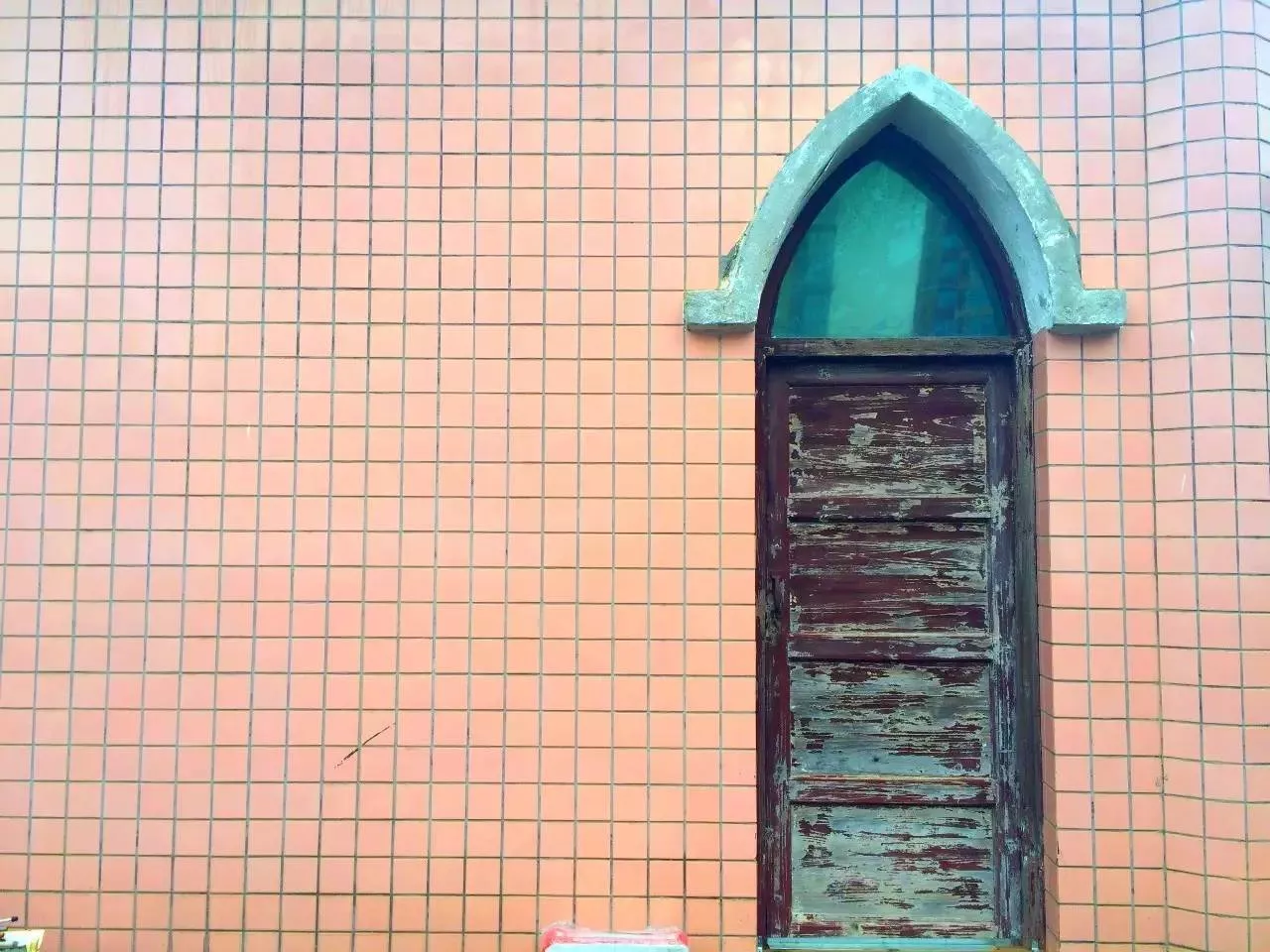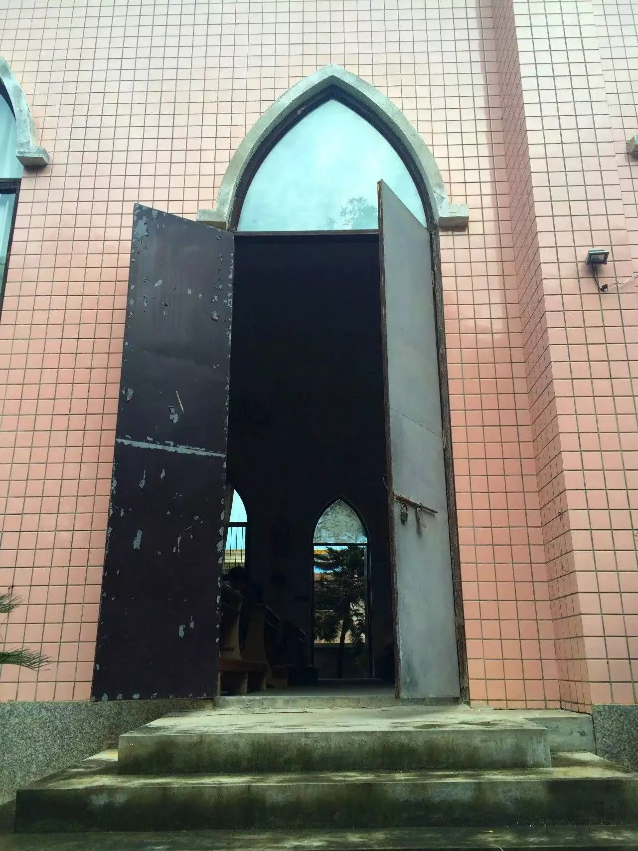 教堂的外觀貼滿了粉色的瓷磚