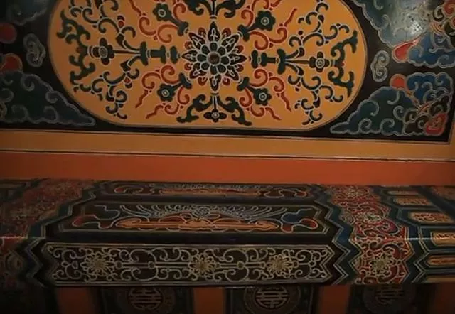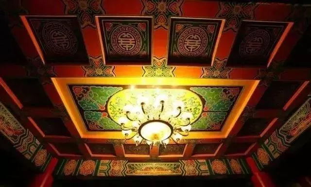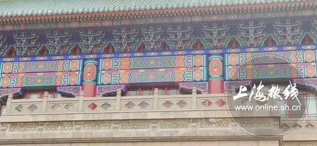 步入大廳,正中的屋頂為歇山頂,兩側(cè)為廡殿頂,頂上裝飾有各色彩色祥云,配上朱紅色的大門,充滿歷史的韻味。 綠瓦大樓的彩繪是所有“大上海計(jì)劃中”最精美的,不僅采用了礦物顏料,而且彩繪持久時(shí)間更久。