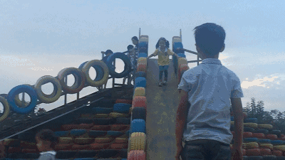 一座輪胎金字塔滑梯,等著你來玩耍哦!