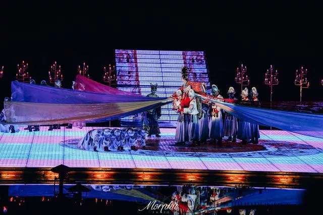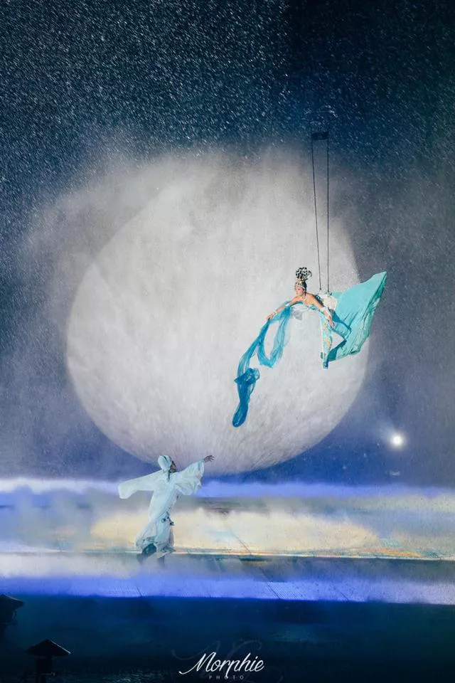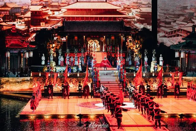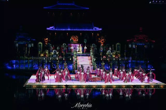 在 九龍 湖上踏浪而來(lái)的楊貴妃,清泉薄霧下的侍女身影,空前繁榮的盛世景象,安史之亂的戰(zhàn)火紛飛……包括 玉環(huán) 入宮、貴妃出浴、貴妃醉酒、安史之亂、馬嵬兵變、七夕盟誓、貴妃之死、仙境重逢等故事情節(jié)以十幕場(chǎng)景,每一幕都讓人無(wú)法移開(kāi)眼球。驪山腳下, 九龍 湖畔,1400年前發(fā)生在唐朝的凄美愛(ài)情,就這樣穿越時(shí)光,徐徐展開(kāi)。