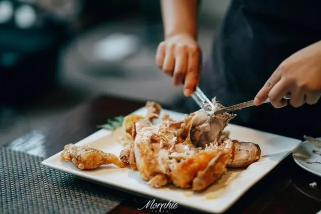 老陜葫蘆雞葫蘆雞是 陜西 名菜,始于唐朝,和華清宮的唐文化非常匹配了。雞肉經(jīng)過(guò)清煮、蒸籠、油炸三步,整體呈現(xiàn)出迷人的金黃色,看起來(lái)就垂涎欲滴。店員親自現(xiàn)場(chǎng)剔骨,之后還能復(fù)原成一只整雞的外形??诟锌梢杂谜褋?lái)形容!真正的皮酥肉嫩,筷到脫骨、入口即化~吐血推薦
