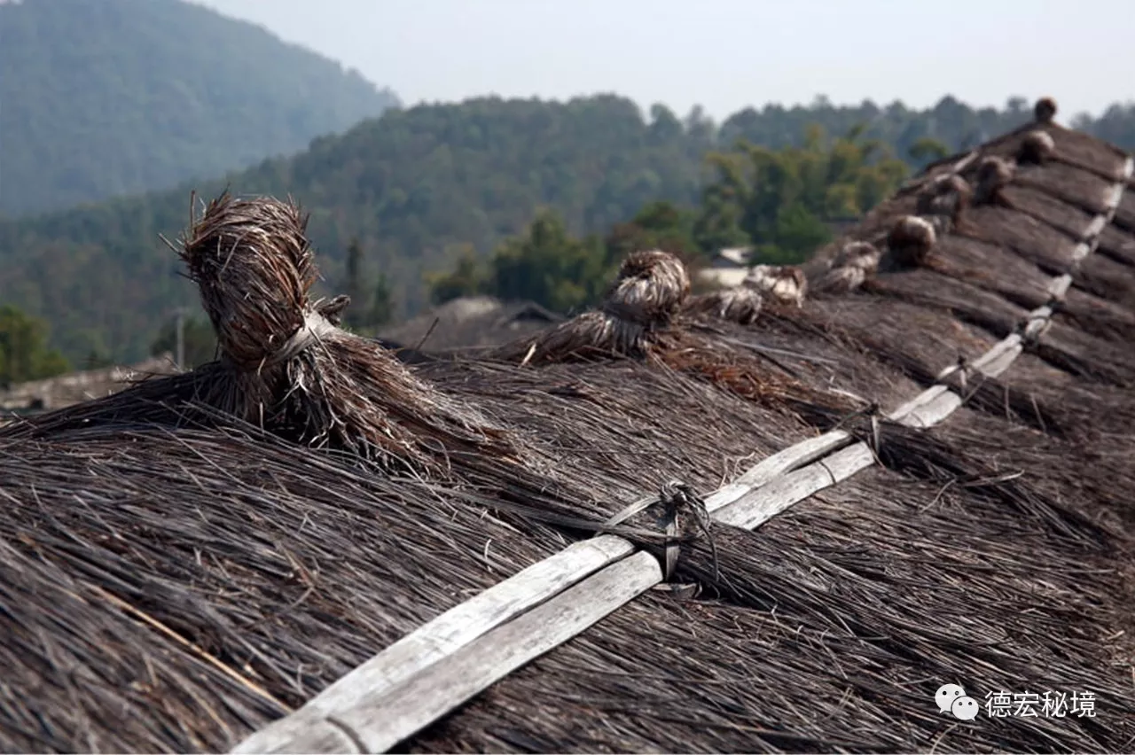 德昂族傳統(tǒng)民居的房頂用茅草覆蓋,四周都有屋檐,俗稱“四檐出水”,房屋的三面兩端和檐口向上呈弧形,這種弧形屋面在結(jié)構(gòu)技術(shù)上要比直線屋面難度大,充分體現(xiàn)了德昂族精湛的傳統(tǒng)建筑工藝和獨(dú)創(chuàng)精神。