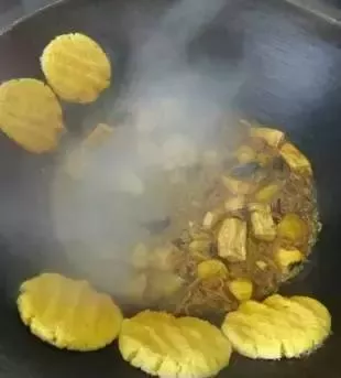 “三烀一炸”其實(shí)就是土豆、茄子、苞米或者南瓜三種菜切塊放在鍋里,加少量的水,蓋緊鍋蓋半蒸半煮,直到熟透 ,北方通常稱這種烹調(diào)的方式為“烀”?!耙徽ā敝傅氖钦u蛋醬,用來搭配三種菜吃的。