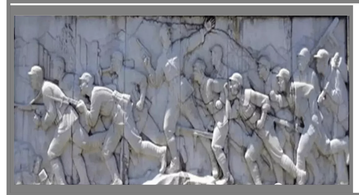 底座為灰色花崗巖砌成,上有栩栩如生的四幅浮雕;正面的圖案是飛奪瀘定橋,兩側(cè)為東北抗聯(lián)抗擊日寇和遼西追擊戰(zhàn),后面是解放平頂山戰(zhàn)斗。碑身呈凹型,正下方有麥穗和齒輪石透雕花環(huán)。