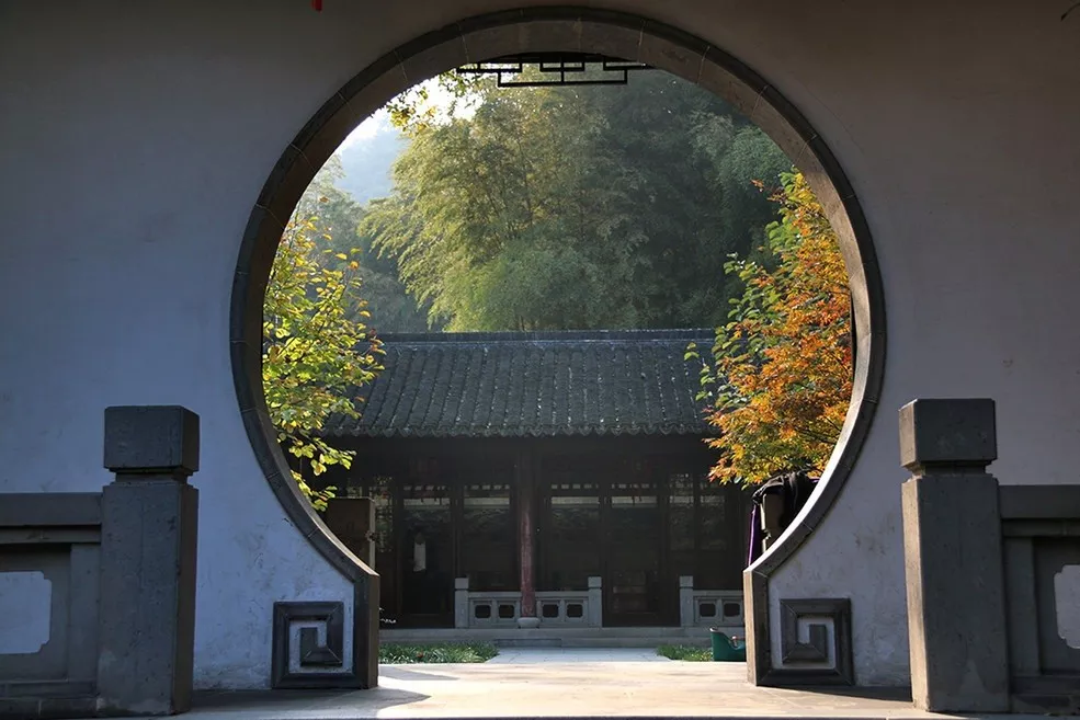 上圖:越過(guò)紀(jì)念館向西為高義園區(qū),是天平山莊的主要建筑。共有四進(jìn),依山而筑,這是高義園前園,兩側(cè)有相對(duì)題字“仁壽”、“智樂(lè)”的圓弧形大門(mén)。