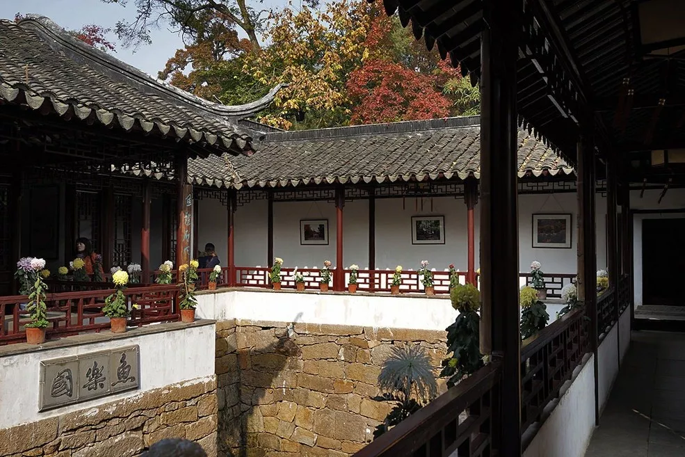 上圖:天平山莊曲廊相連,庭院相隔,間置池石花木,曲折幽深,得影隨形,步移景異。