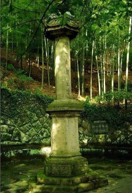 進圓洞門便是柏堂,堂前一汪蓮池,堂內放著創(chuàng)始人群像圖,東面長廊嵌著十幾塊書畫石刻。堂后斜坡往上,印泉邊山巖上藏一小碑,居然是李叔同出家前埋下的各種印藏。