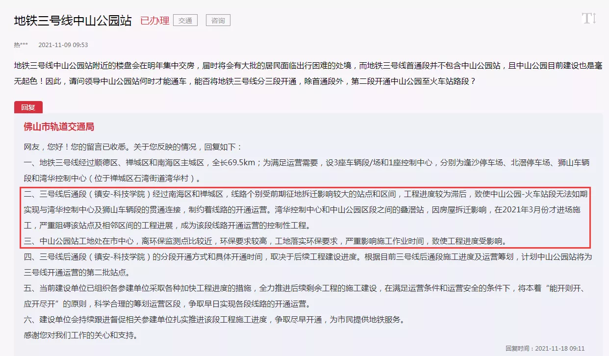 佛山地鐵3號線中山公園何時開通?為何進度緩慢?官方回應(yīng)了