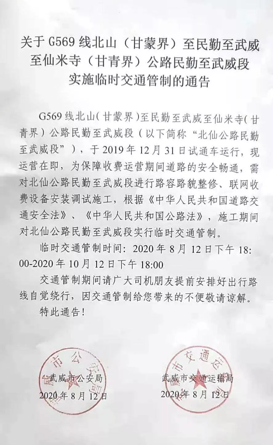 關(guān)于G569線北山(甘蒙界)至民勤至武威至仙米寺(甘青界)公路民勤至武威段實(shí)施臨時(shí)交通管制的通告來(lái)源:武威公安交警微發(fā)布