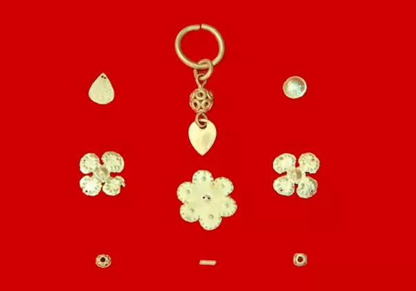 月池里2號墓為封土石室壁畫,墓葬用經(jīng)過修整的石塊砌筑,表面涂抹白灰作為地仗。白灰地仗脫落嚴重,墓室內(nèi)發(fā)現(xiàn)許多可能是描繪 太陽的壁畫殘片。發(fā)掘過程中,出土金飾9件,其中包括金耳飾1件、花形金飾3件(四瓣花飾1件、六瓣花飾2件)、心形金飾片1件,其他小型金飾4件。發(fā)掘者認為墓葬年代在 6世紀前半葉。