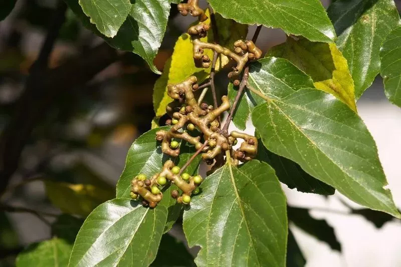 枳椇的葉片寬卵圓形或橢圓形,夏天的時(shí)候會(huì)開(kāi)聚傘型的白綠色小花,到秋季時(shí),就會(huì)明顯看到許多“果實(shí)”掛在枝頭。