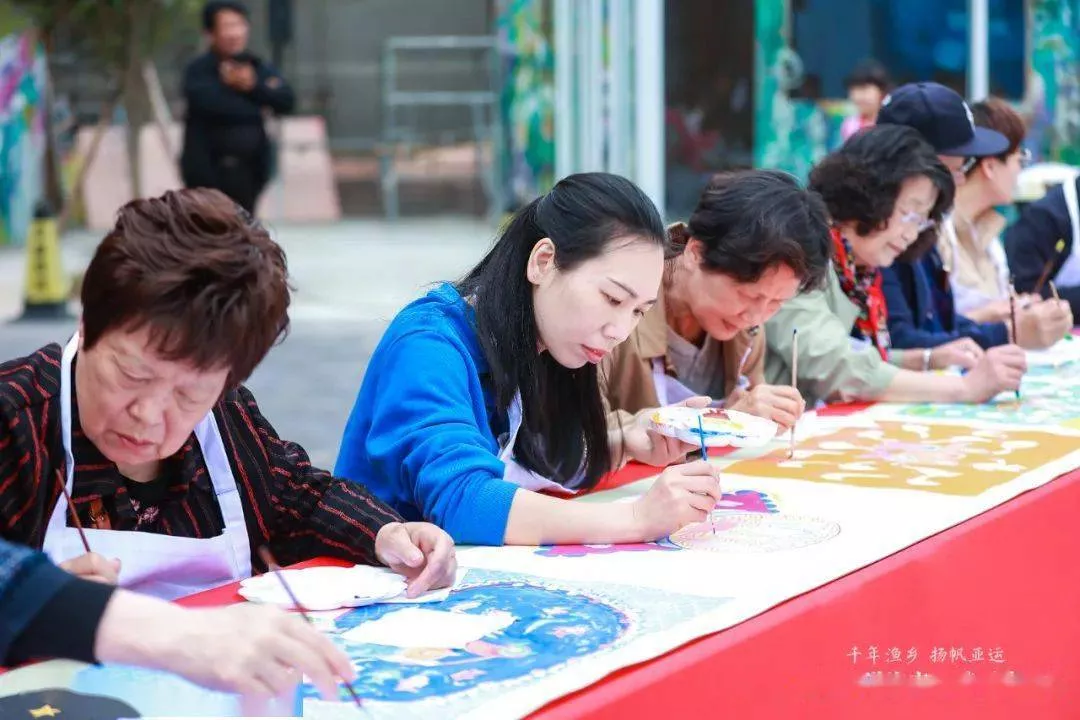 開館儀式上舉行了首批海洋漁文化義務(wù)講解員聘書頒發(fā)、“護航亞運、漁我同行”守護最美海岸線志愿者授旗等,尤其是百人百米農(nóng)民畫創(chuàng)作現(xiàn)場,吸引了大量游客和當(dāng)?shù)厥忻窕佑^摩。