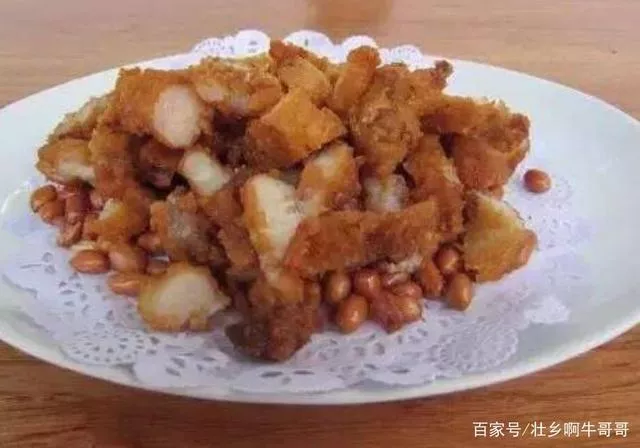 酥肉地豆是廣西玉林十大特色小吃之一,選用豬肉、地豆(花生),將豬肉切片,加配料,腌制5小時,用淀粉裹滿下油鍋翻炸,呈金黃色撈起,同樣將花生下油鍋炸至金黃色即可。成品外酥內(nèi)嫩,甘香可口,地豆風(fēng)味獨特。