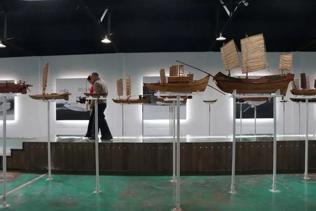 揭開這段“海上旅程”序幕的便是“揚帆”展廳了。進入展區(qū),豎立在展區(qū)東側(cè)的大型風(fēng)帆陣帶來了巨大的視覺沖擊,“歸航”二字氣勢恢宏,代表著揚帆遠航的寓意。展區(qū)的西側(cè)是模擬古港口的實景,再現(xiàn)昔日商貿(mào)繁榮的碼頭場景。